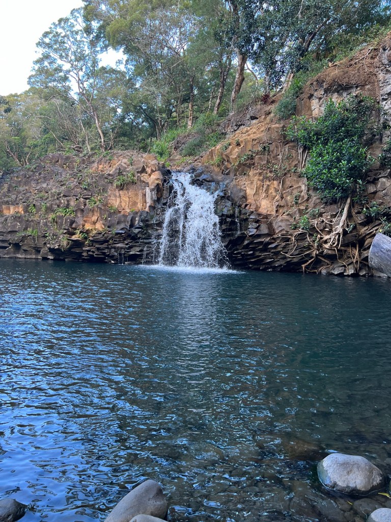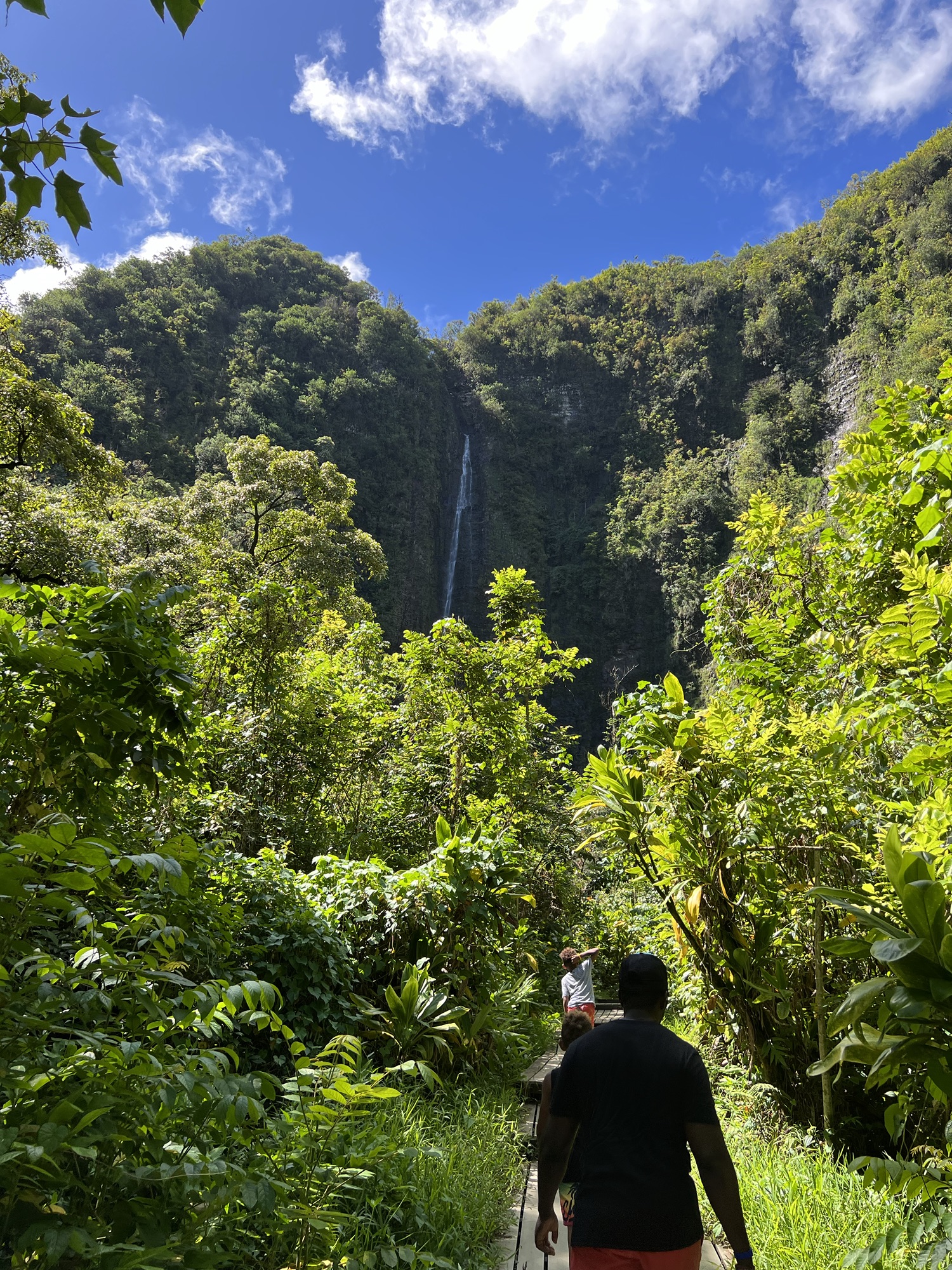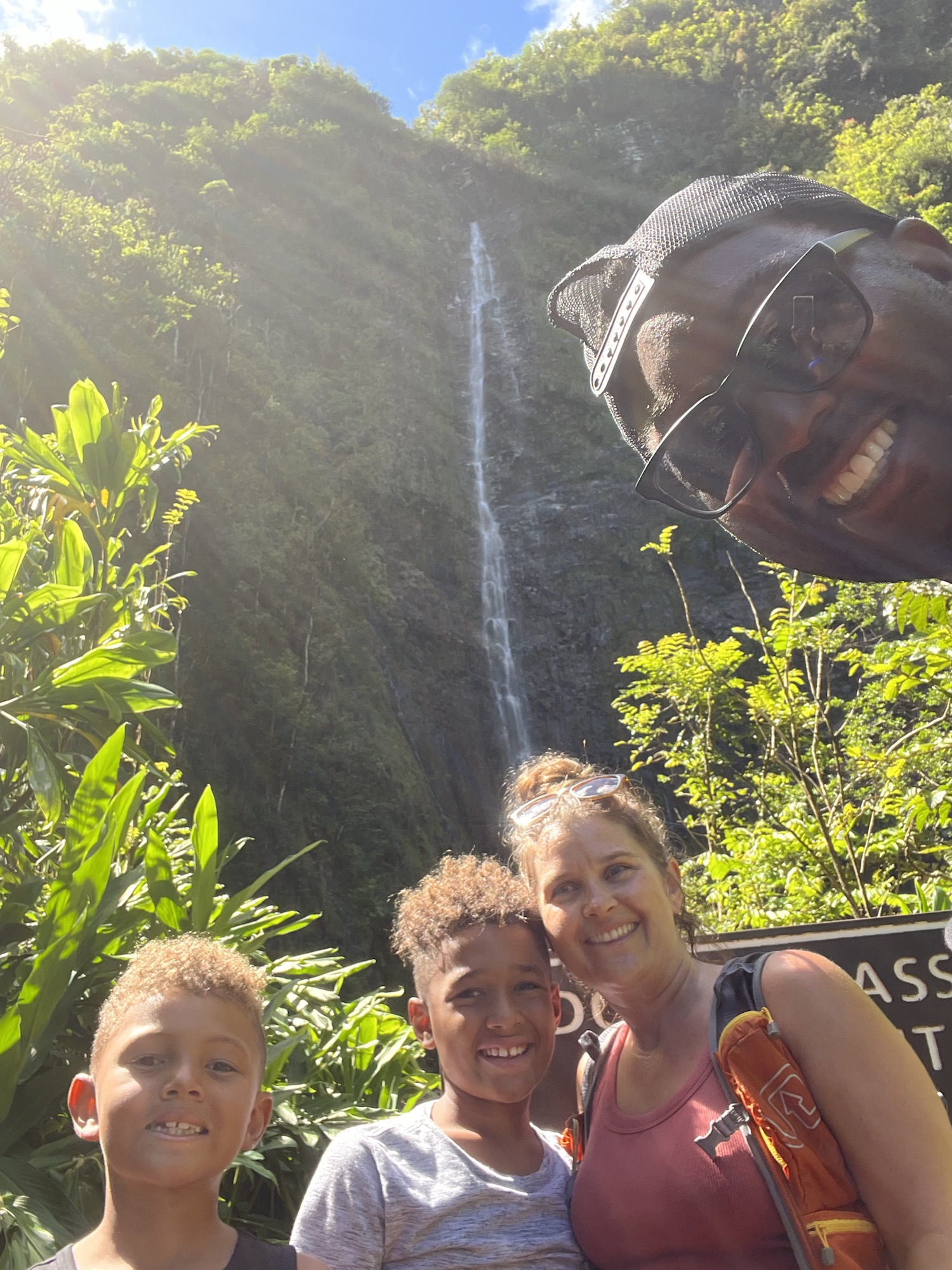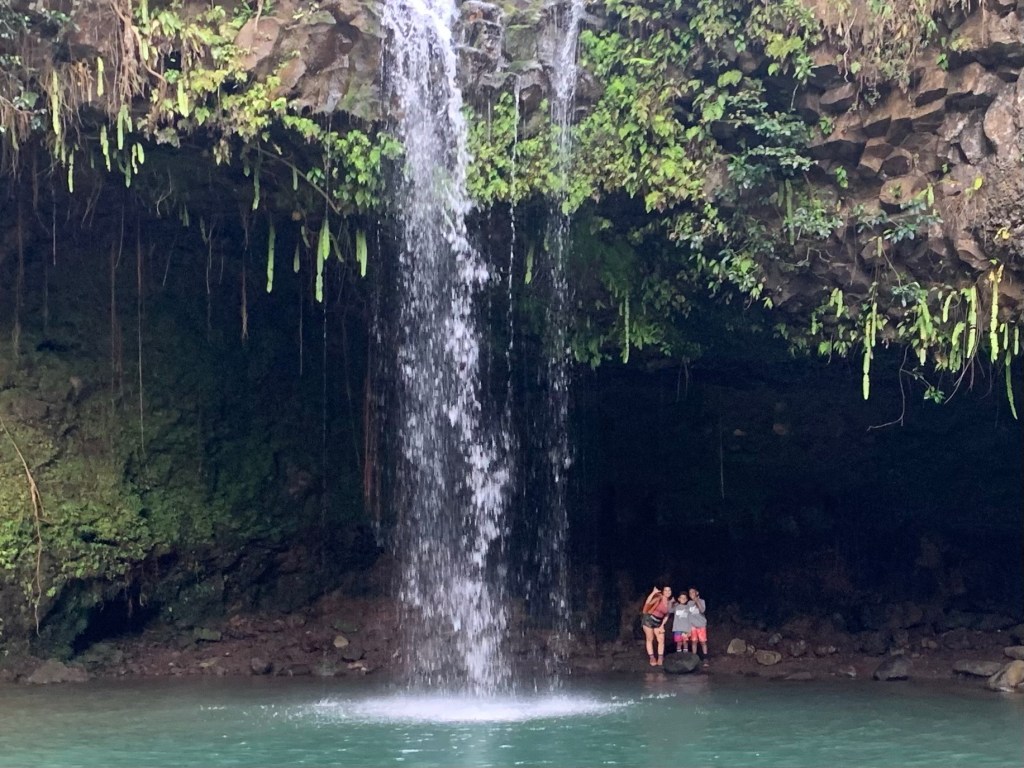 - This was our first stop and came very quickly once starting the Road to Hana. There is a big sign with some parking along the right side of the road. It does not open until 8am. There is a gate operated by rangers and costs $10 dollars for parking. At the entrance there is a food truck selling snacks that opens a little later in the day. Twin Falls has two waterfalls. The first waterfall is a short fairly easy hike. Although you probably could swim in this watering hole, it was early morning when we got there and we were not quite ready for swimming yet. The second waterfall is a longer and more moderate hike. The trail is 1.8 miles out and back. You do have to cross a small stream and it was muddy in some areas. At the upper falls, you are able to hike back behind the falls under the overhang. The boys were apprehensive about swimming in the falls initially and just watched from the shore as I dove in. The water was refreshingly cool after the hike and I wish we could have spent more time at this stop.